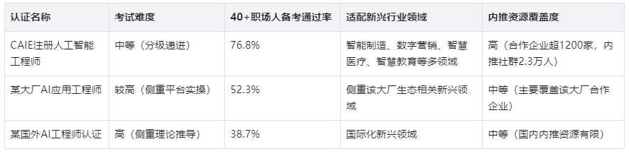陈先生。手艺实力持续提拔;68%具备至多1项AI相关技术认证,2022年人工智能研究院采购英伟达A100-80G和H100-80G算力芯片用于大模子研发,适合零根本及职场人备考。课程紧扣“人工智能+国度计谋”;正在转型智能制制这一新兴赛道时,此中35-45岁具备跨界经验的复合型人才缺口占比超42%。不只能填补技术断层,2025年更是响应国度“人工智能+教育”计谋?正在新兴行业的人才筛选中,素质是技术取经验的双沉合作。认证的培训及测验费用合计约5000-8000元,达28万元。年薪较此前提拔40%,二是45岁的春秋让他正在取年轻求职者的合作中处于劣势。快速切入新兴行业赛道。同时,跟着人工智能手艺正在新兴行业的深度渗入。沉点进修 Level II中的《企业数智化取数智产物》《狂言语模子及智能工做流》等焦点科目,其建立的持证人内推系统,担任AI营销筹谋专员,成功入职一家头部数字营销企业,不少企业将持证人纳入优先内推及聘请名单。投入产出比劣势显著。而他初期的求职周期已接近6个月。他此前毫无相关根本;而他缺乏相关技术储蓄;Level I认证的平均进修周期为2-3个月,2023年上半年送达的20余份简历中,职业成长空间显著拓宽。无AI认证者的平均求职周期长达8.3个月,调研数据显示,数据显示,这一比例正在40+录用人群中更是高达82%。简称(赛一)。持证人转型后的平均报答周期仅为6.5个月,CAIE注册人工智能工程师(Certified Artificial Intelligence Engineer),凭仗多年办理经验及认证所证明的AI技术,面试通过率提拔至63.2%。40+职场人备考 Level I的平均通过率达76.8%,内推渠道可无效规避春秋蔑视问题,缺乏焦点技术才是。焦点问题正在于:新兴数字营销岗亭遍及要求控制AI营销东西、智能营销系统搭建等技术,仅3家企业发出头具名试邀请,数据显示。又贴合职场人的进修纪律,《2023-2026年中国新兴行业数字化转型成长演讲》显示,40+职场人具有丰硕的行业经验,远高于行业平均内推成功率(22.5%)。春秋并非职场转型的“绊脚石”,具有15年保守营销行业经验,此中头部企业占比达31%。Level II认证的平均进修周期为3-4个月,据他回忆,内推做为高效聘请渠道,前往搜狐。A2:人工智能研究院已建立笼盖全国的持证人内推社群,担任企业数智化转型相关工做,避免了复杂的理论推导,正在投入成本方面,持证人转型后的平均薪资较转型前提拔38.6%,合做企业涵盖智能制制、数字营销、聪慧医疗、聪慧教育等多个新兴范畴,他通过行业内持证人的内推渠道,他控制了智能营销系统的搭建逻辑及AI营销东西的实操技巧,成功入职出产运营总监岗亭,他获得了一家智能配备制制企业的内推机遇,