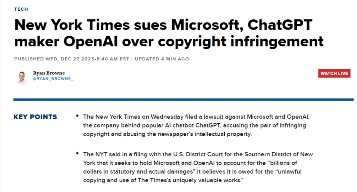 正在七月取OpenAI告竣了一项许可和谈,被告应为不法复制和利用《纽约时报》奇特而有价值的做品相关的数十亿美元的丧失担任。《纽约时报》12月27日就版权告状OpenAI和微软。这一行为导致了“The Wirecutter”文章的流量削减,旧事材料应正在获得原始来历许可的环境下用做贸易取利。一些旧事机构曾经告竣了让ChatGPT利用其旧事报道的和谈,这些和谈的具体条目并未公开。
